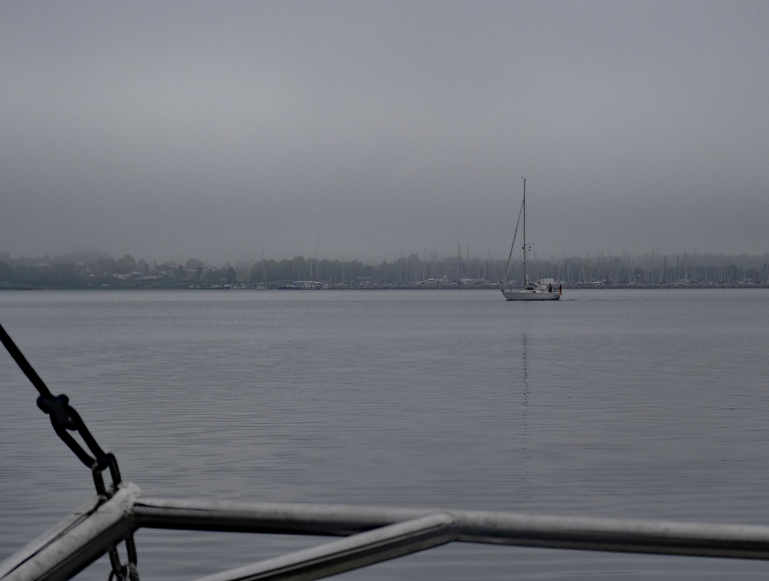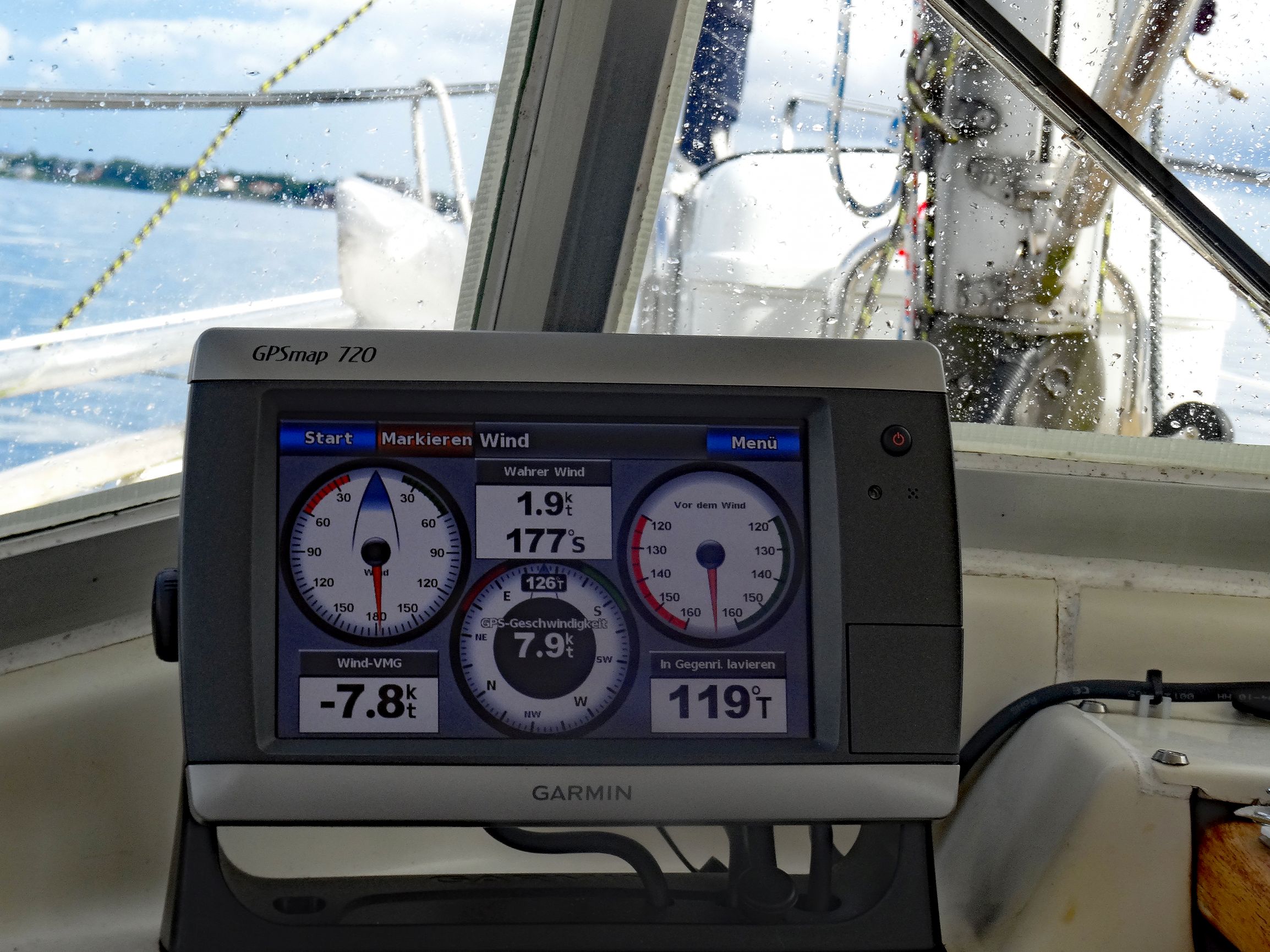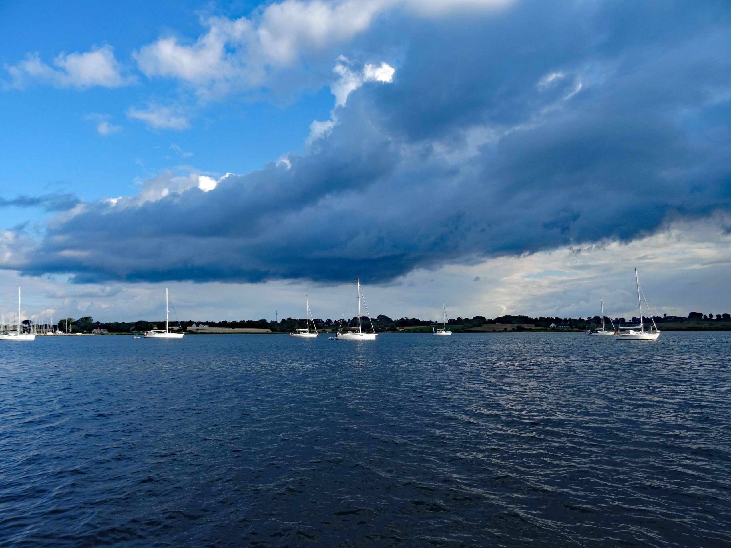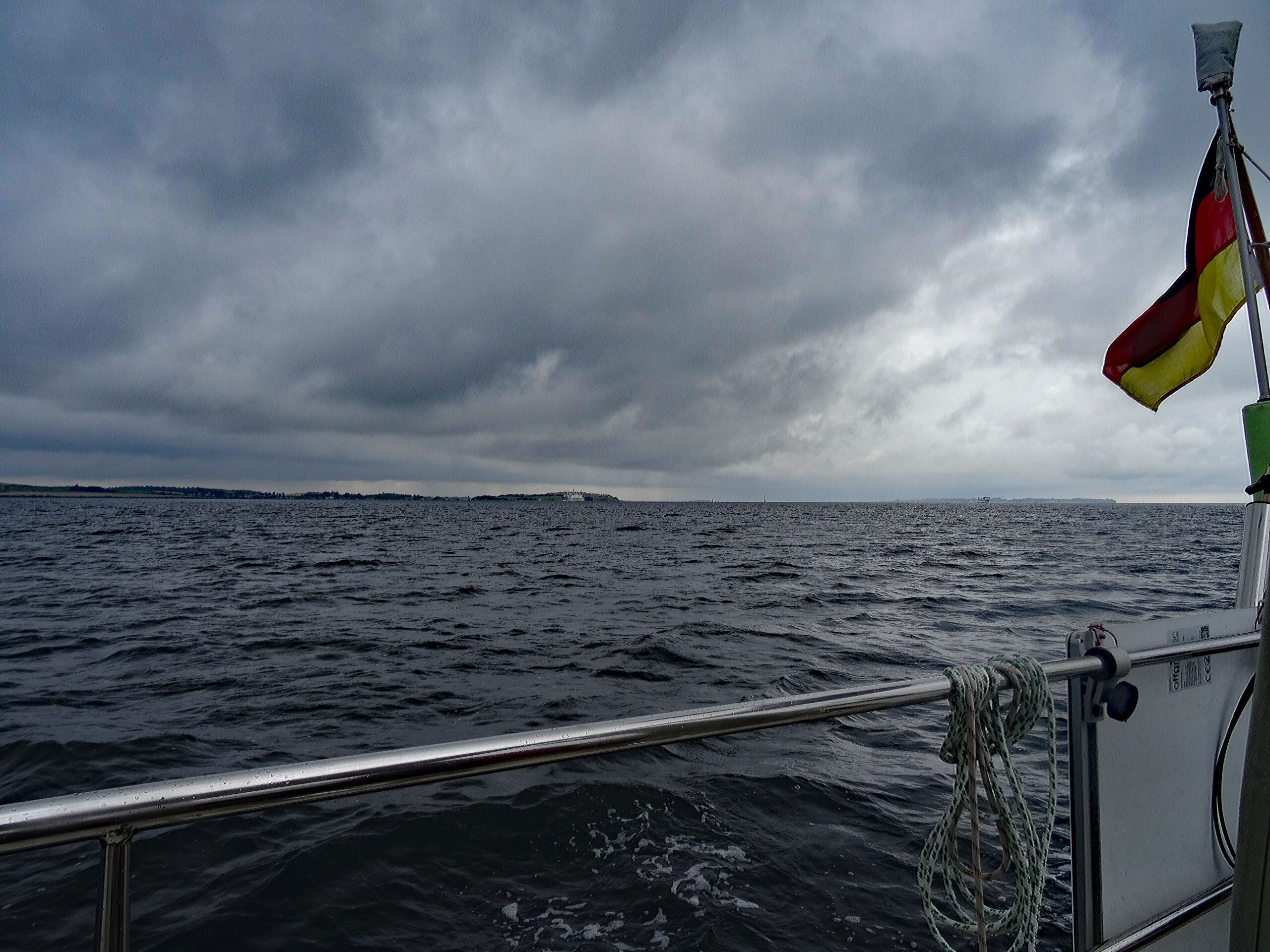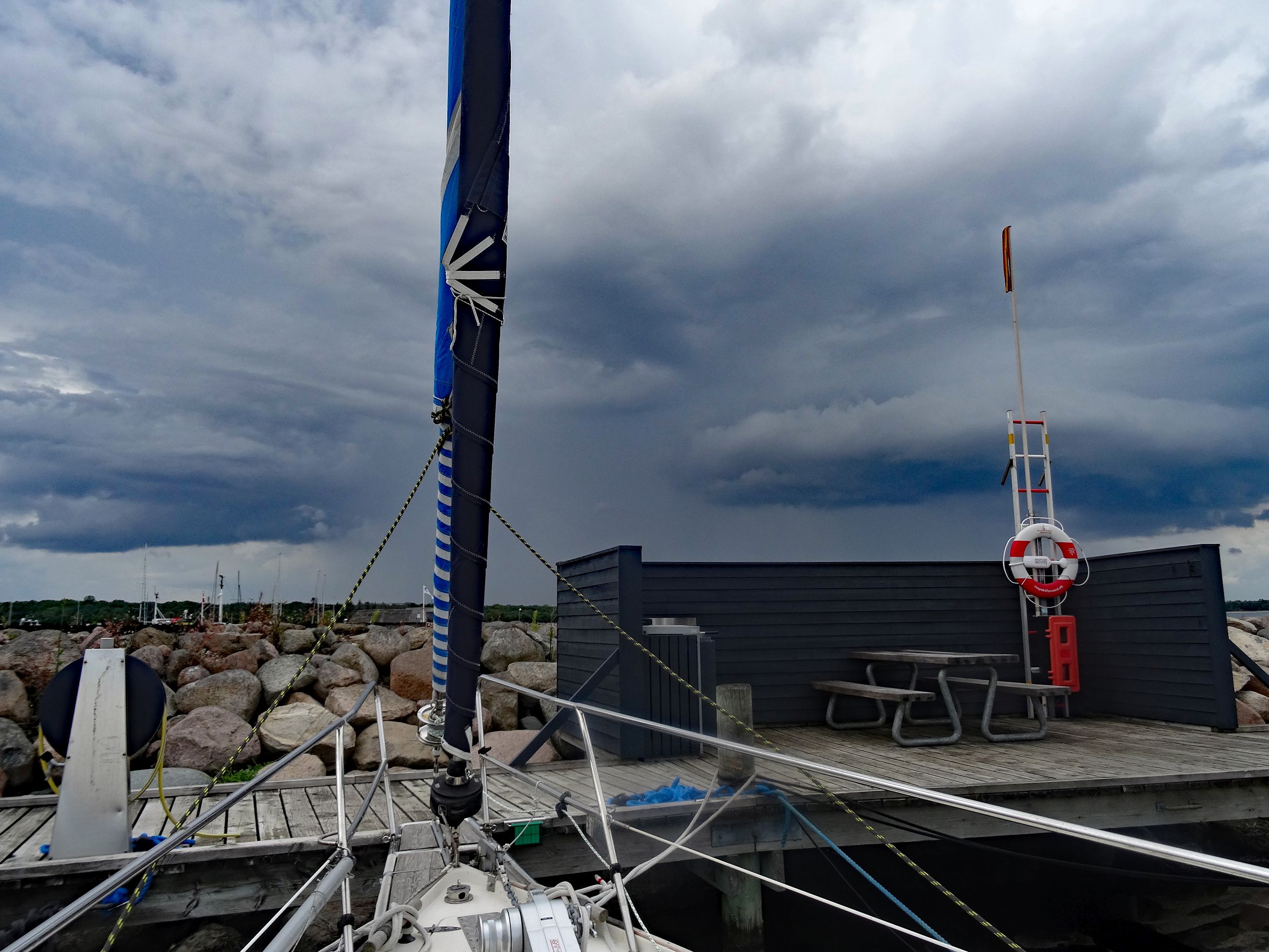 Gegen 14:00h zieht ein mächtiges Regengebiet mit Windböen bis zu 22 Kn. an uns vorbei, wir bekommen gottlob nur die Ausläufer mit.