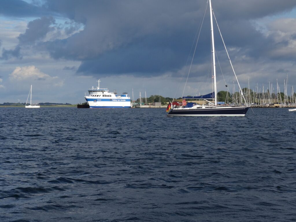 Wir fahren in das betonnte Fahrwasser Richtung Marstal, hier biegen alle Boote ab, der Hafen wird wohl gut gefüllt sein. Deshalb fahren wir weiter durch das gewundene Fahrwasser Richtung NW nach Ærøskøbing. Zwischenzeitlich Böen bis zu 26 Kn. und eine hohe, kurze Welle. Aber wenigstens kein Regen, das grenzt schon fast an ein Wunder.
