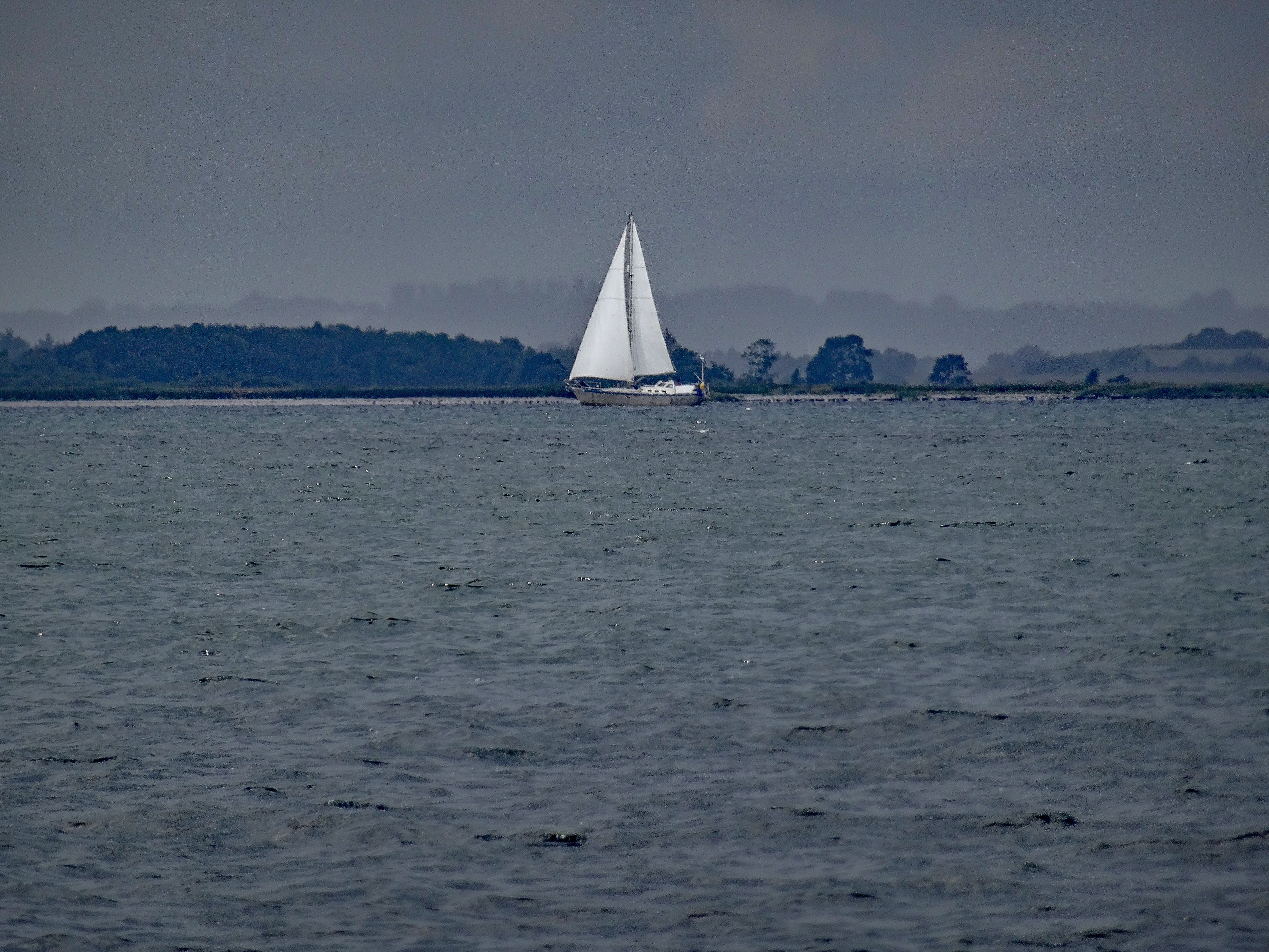 Nun hat der Wind inzwischen auf gut Bft 4 aufgefrischt, weiter aus NW. Aber er spielt Katz und Maus mit uns, mal ganz weg, dann auf einen Schlag wieder kräftig da.