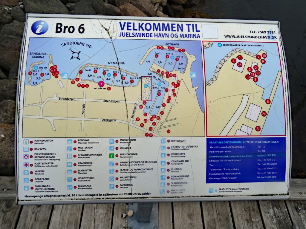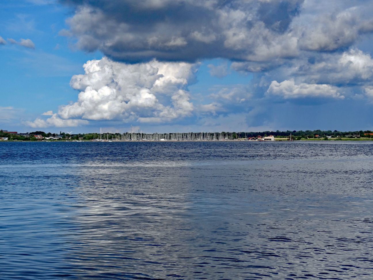Dann kippt die Strömung in Richtung Nord. Gegen 14:15h erreichen wir den Yachthafen von Juelsminde. Eigentlich sind es mehrere Häfen, wenn wir das richtig gesehen haben.