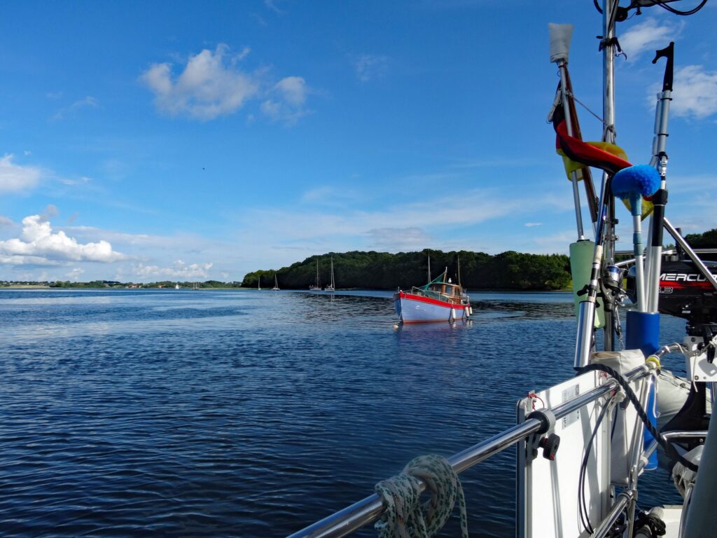 Tja, er hat den letzten freien Platz in diesem Hafen ergattert und wir hatten das Nachsehen. Also noch weiter zurück. Nun wollen wir doch in der Bucht vor der Insel Fænø ankern,