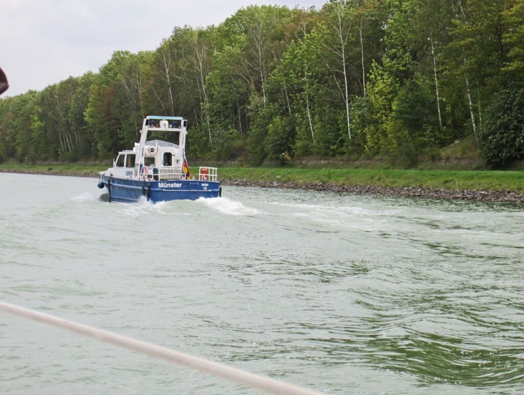 Schon bald danach sind wir vor der Schleuse „Münster“… die einzige für den heutigen Tag, wir müssen ca. 15 Minuten warten und können dann ein- und auch bald ohne Probleme wieder ausfahren, vor uns ein Berufsschiff . . . hinter uns ein niederländisches und ein deutsches Motorboot.