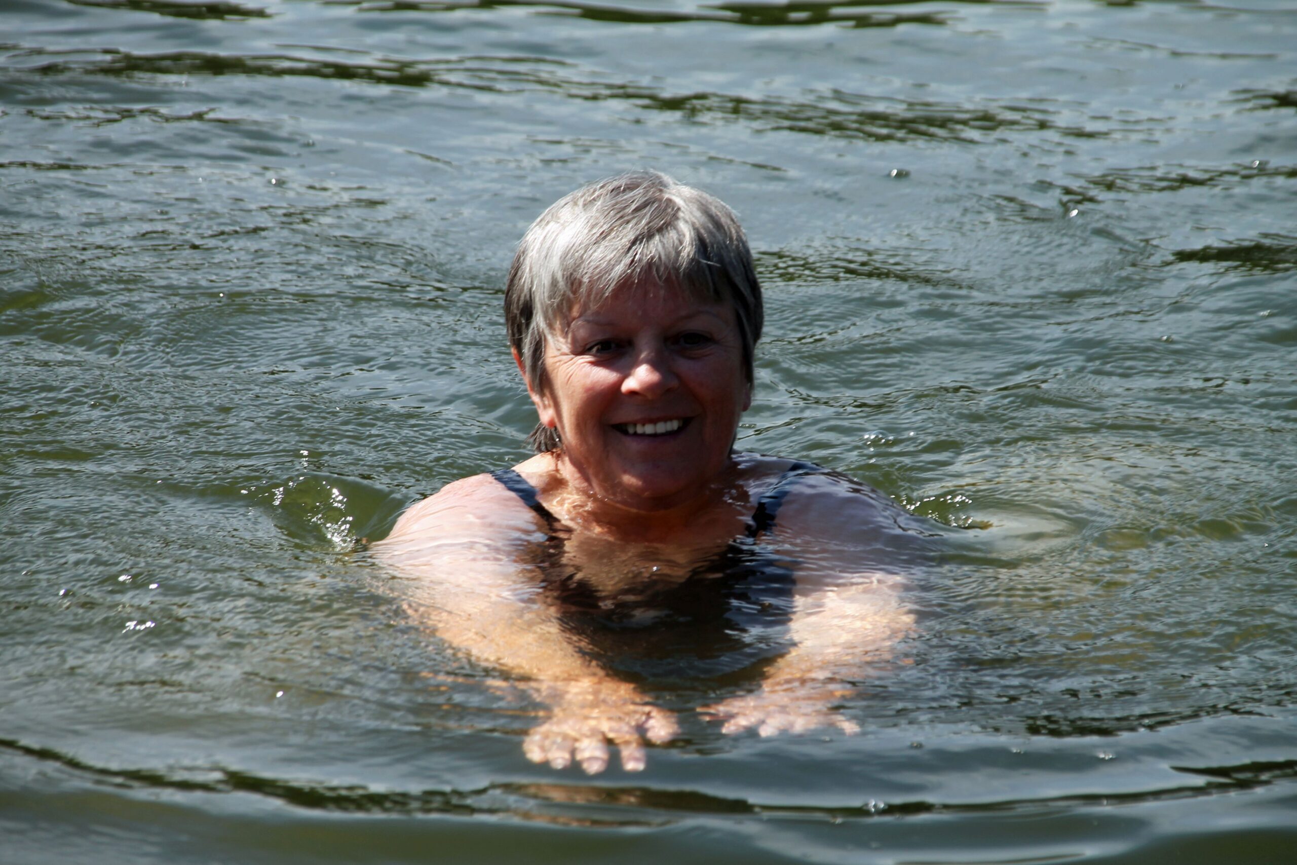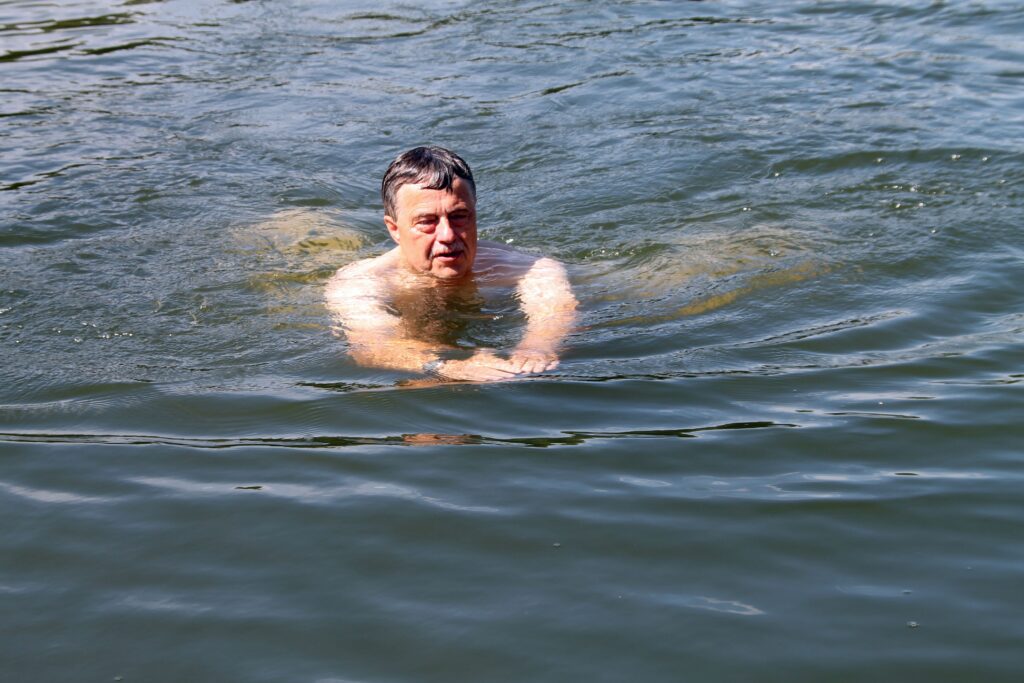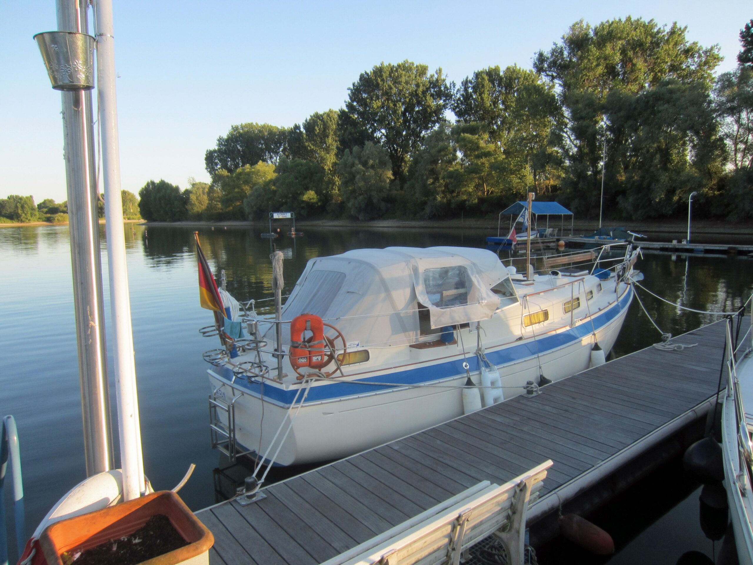 einmal abkühlen tut gut. Immerhin weht die blaue Flagge. Wolfgang schaut nach der Schraube – sie ist völlig frei, Bewuchs ist keiner zu spüren und zu sehen. Also können wir uns das Kranen auch sparen.