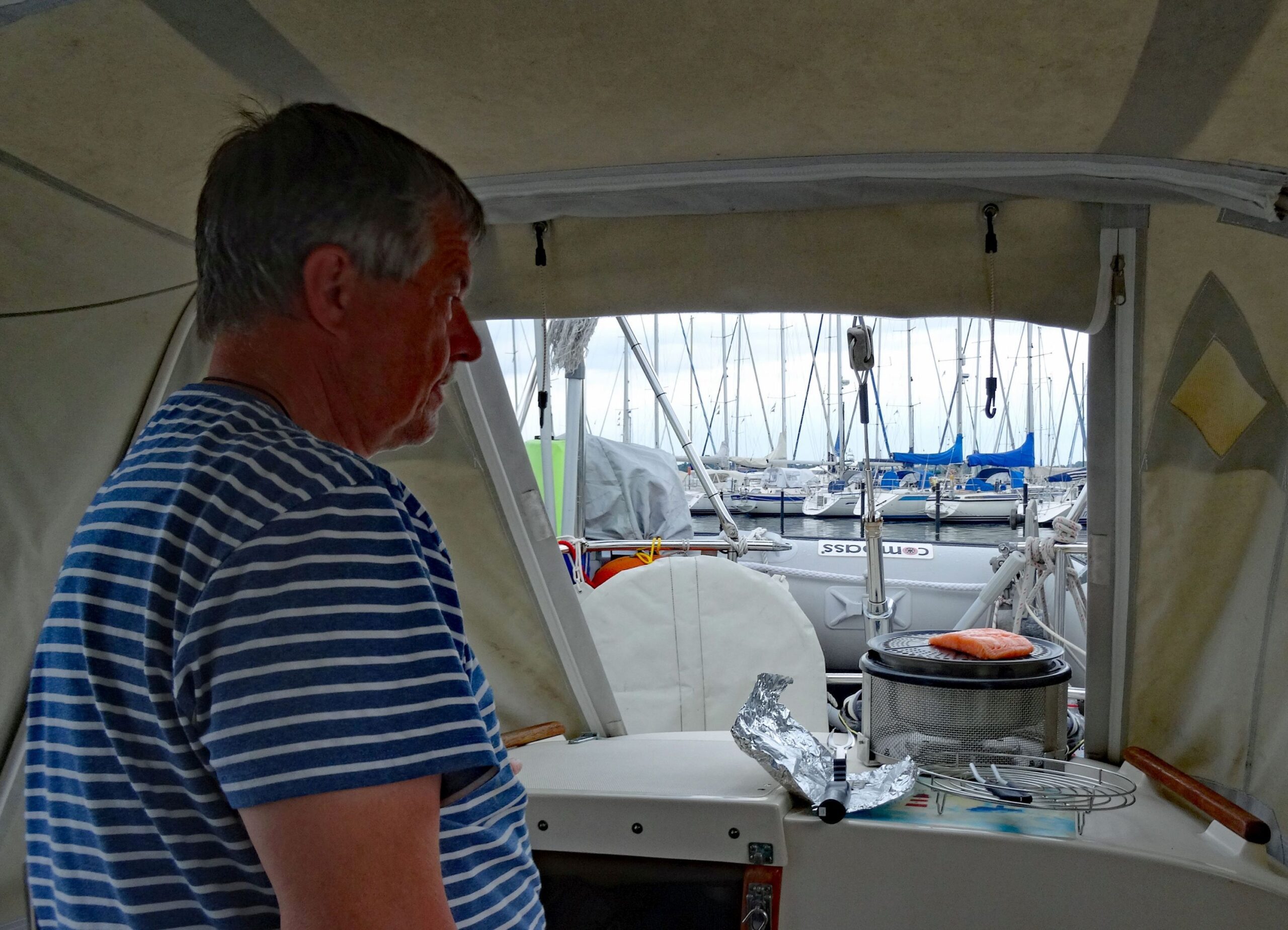 Abends wollen wir Lachs grillen, der Cob muss doch wenigstens einmal in diesem Jahr genutzt werden. Hier ist auf dem Hafengelände auch eine schöne große überdachte Grillstätte.