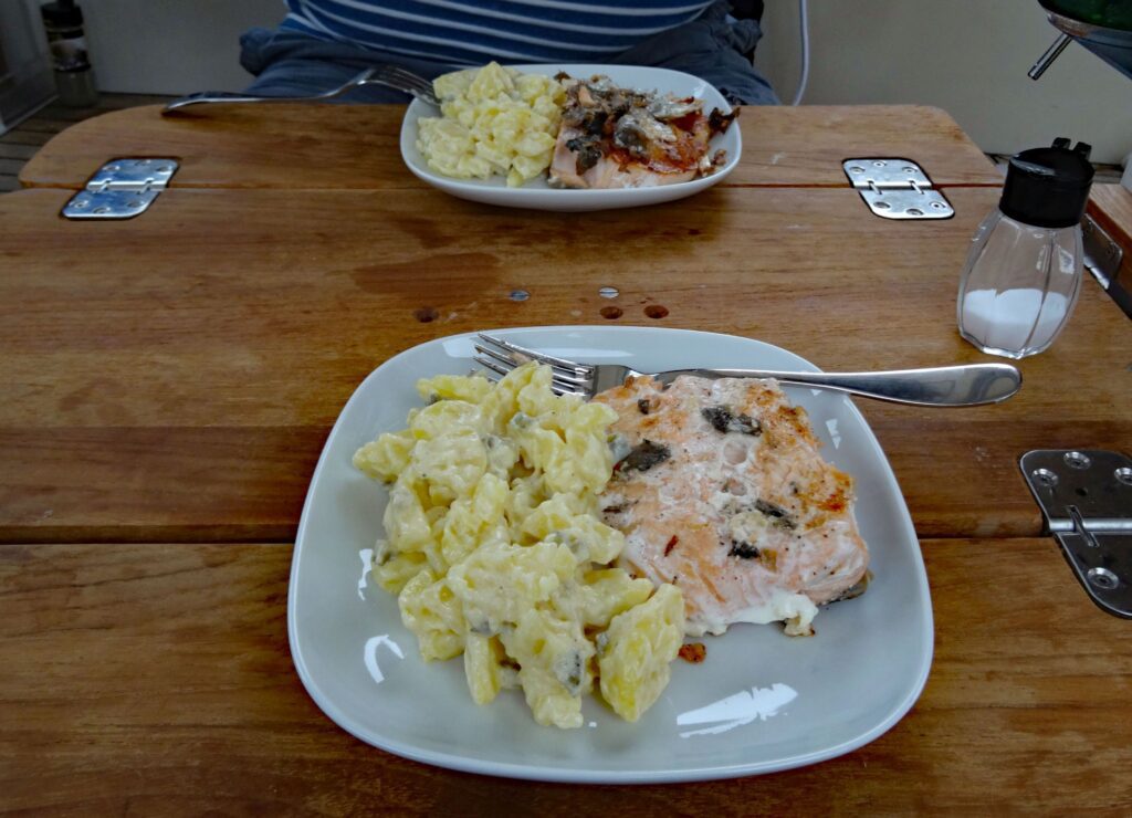 Der Lachs wird vorzüglich, und der selbst gemachte Kartoffelsalat rundet das Ganze zu einem wunderbaren Schmaus ab.
