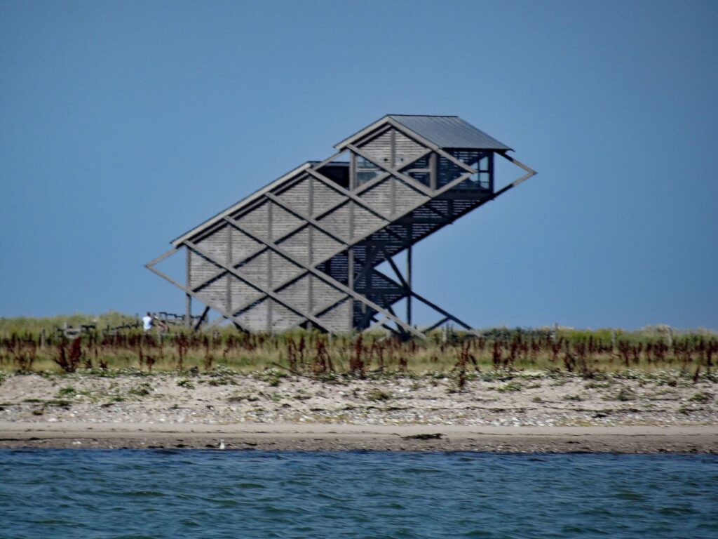 Bei der Einfahrt in die Bucht von Heiligenhafen begrüßt uns der Vogelbeobachtungsturm auf dem Graswarder des NABU