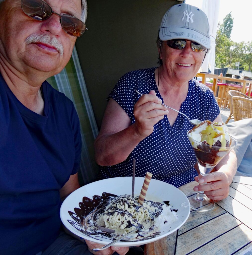 Wir saßen geschützt in einem Strandkorb direkt am Wasser und ließen uns ein großes Eis schmecken.