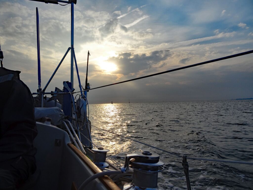 Gut 3 Std. später können wir segeln. Aber mit dem Groß haben wir zu viel Krängung, sodass die Enden des auf der Heckplattform stehenden Schlauchbootes immer wieder im Wasser schleifen.