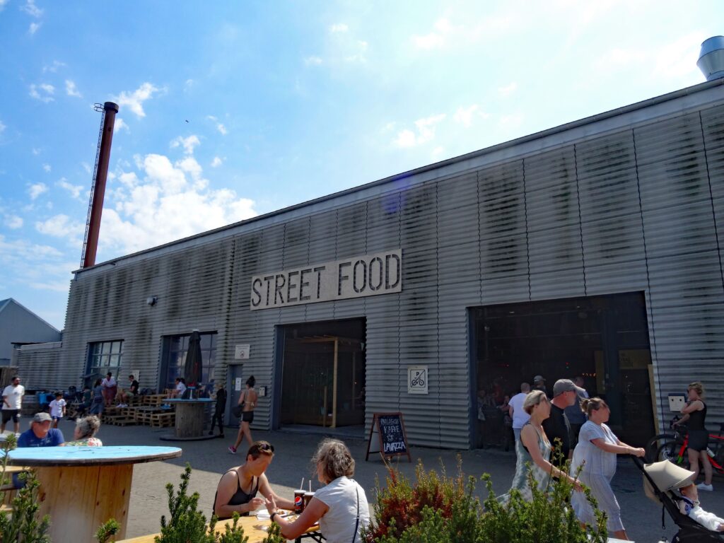 Am Ende unserer Tour essen wir noch ein Eis vor der „Streetfood-Halle“, eine alte Fabrikhalle, in der es viele verschiedene Shops mit Streetfood gibt.