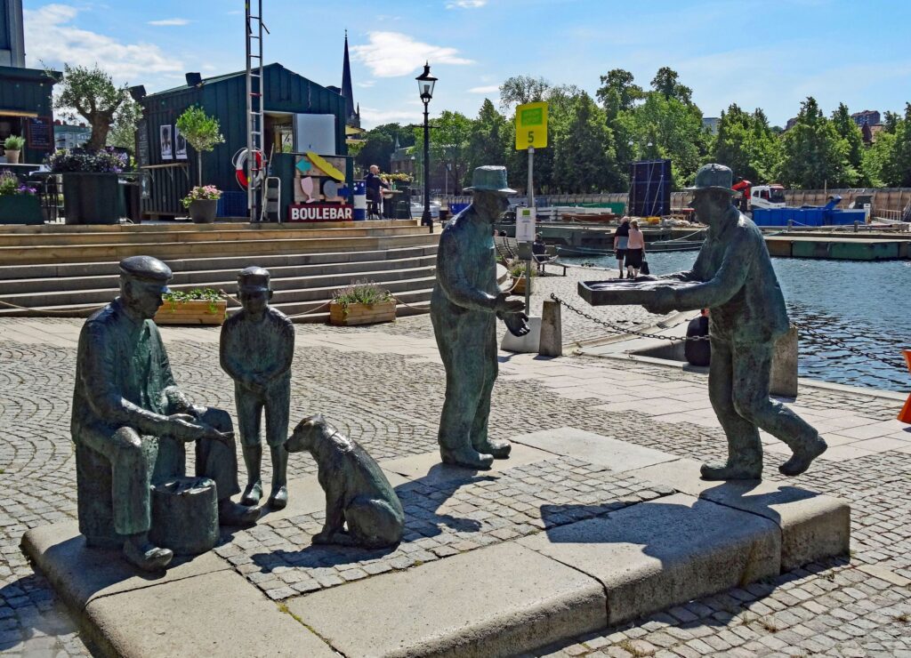 Bronze-Skulptur «Skärgårdsfiskare» (Schärenfischer) vor der Fischhalle