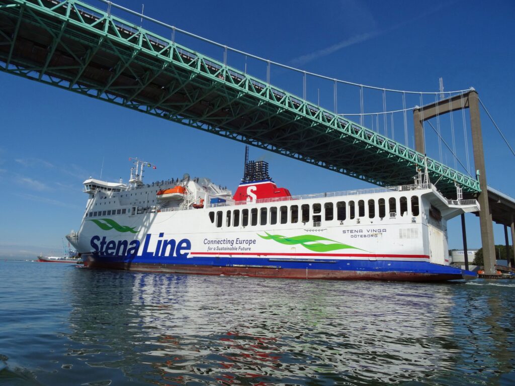 Die 1. Brücke, die Älvsborgsbron ist mit 45 m Durchfahrtshöhe für uns hoch genug, wenn selbst die StenaLine durchpasst ;-))
