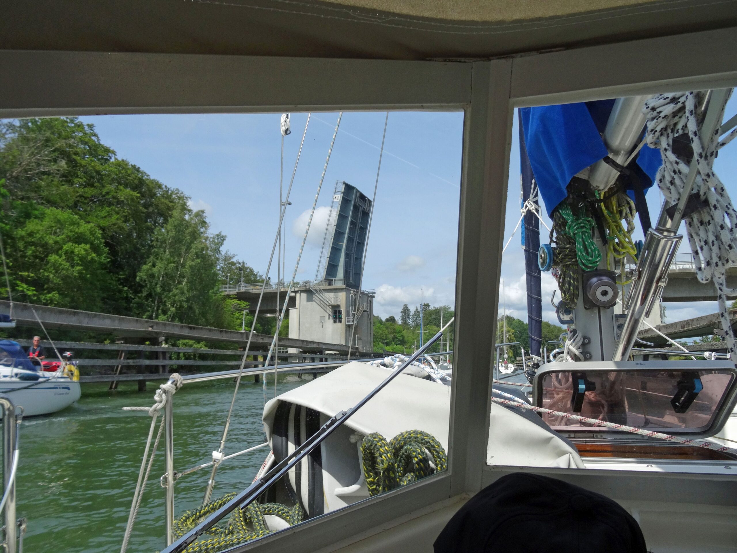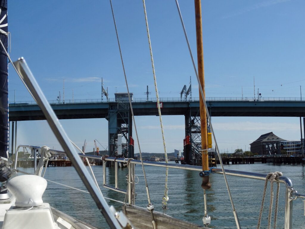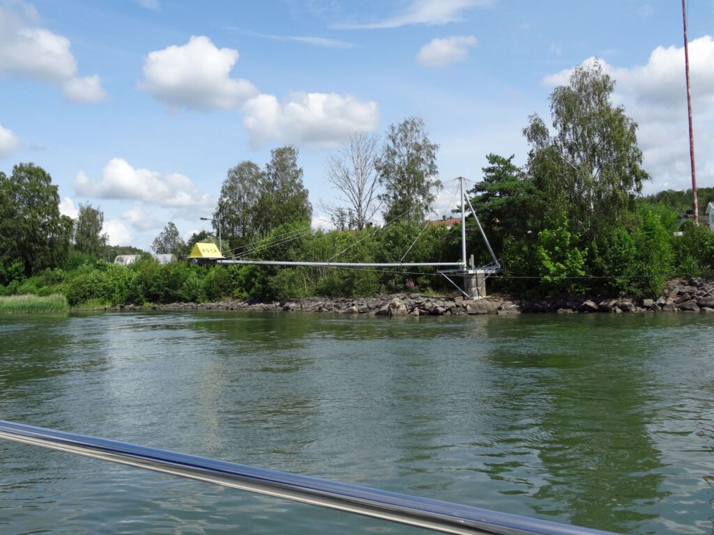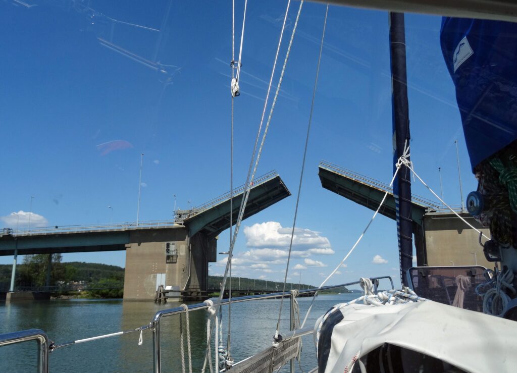 13:45h Jordfallsbron. Nachdem Joachim es vergeblich versucht hatte, bekomme ich über Funk Verbindung zum Brückenwärter. Seine Bitte, näher an die Brücke heranzufahren, damit die Öffnungszeit verkürzt wird, befolge ich, die anderen nicht. Trotzdem wird geöffnet und wir können passieren.