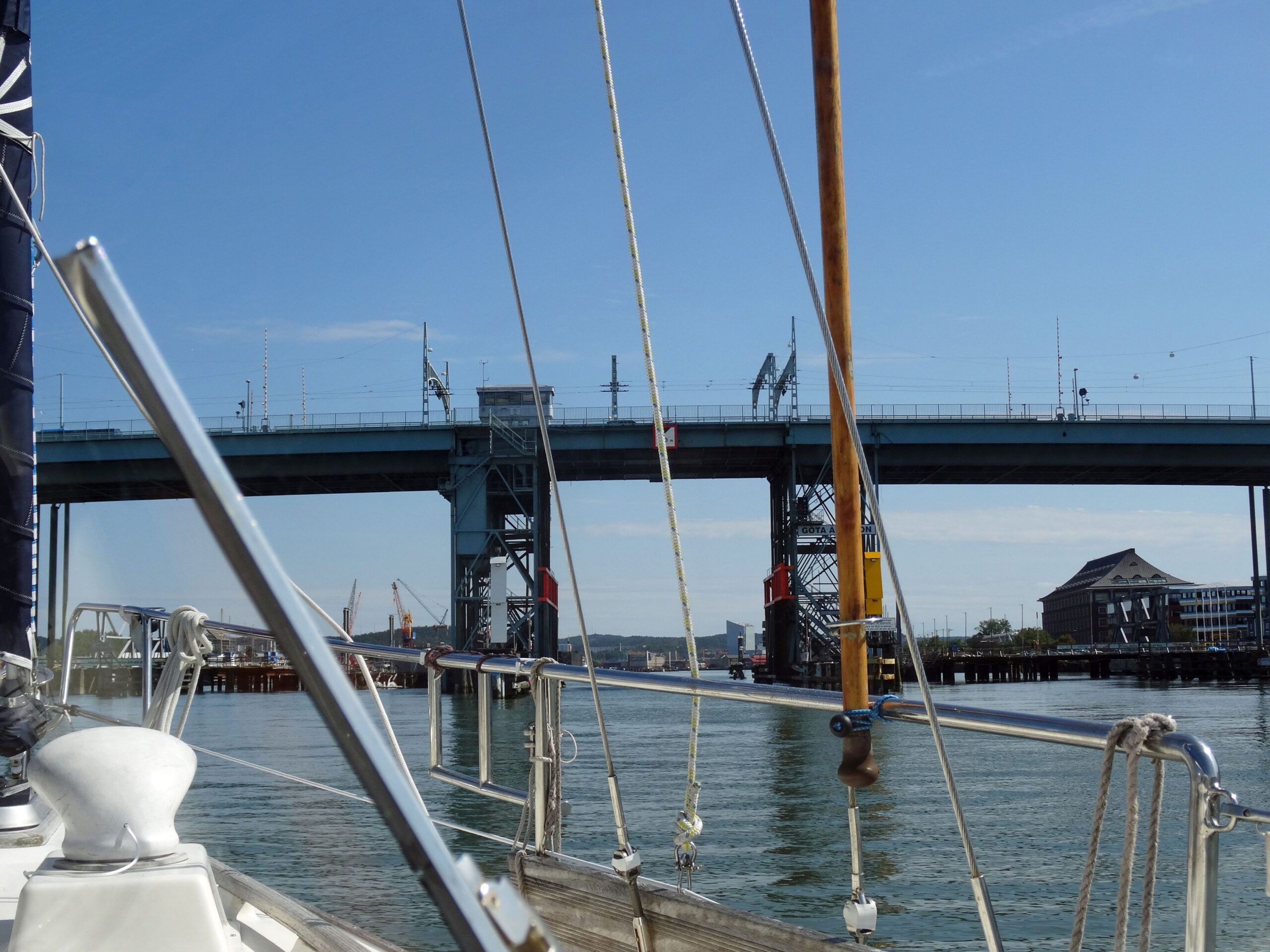 12:00h Marieholmsbron, auf Funkanfrage soll in 10-15 Min. die Drehbrücke öffnen. Es dauert dann aber doch fast 30 Min.
