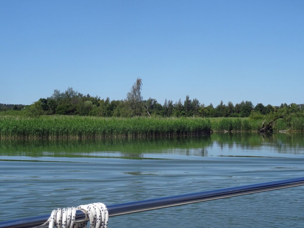 13:20h Ausfahrt aus der 4. Schleuse. In der 3. Schleuse haben wir vorher die Kanalgebühr von 1000 SEK gezahlt. Dazu kommt eine Bedienstete aufs Schiff und man bezahlt per Kreditkarte. Unmittelbar hinter der 4. Schleuse biegen wir links ab zu einem kleinen Längsanlegesteg, der Gästehafen von Åkers Sjö. Das war der Tipp eines Seglers, den wir in Lilla Edet getroffen hatten. Sehr guter Liegeplatz, kostenlos, trotzdem mit Strom, Wasser und einer Toilette und Dusche.
