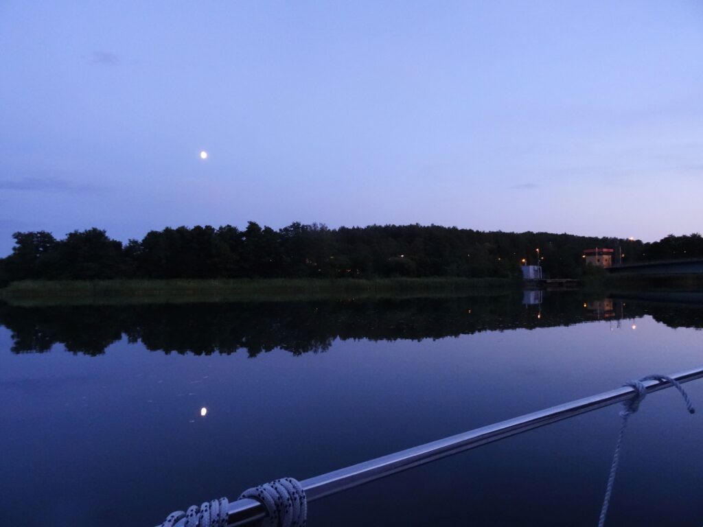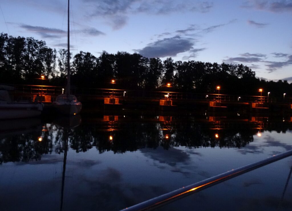Nach dem Abendessen sind wir noch auf die Marte Meo. Margots erste Schleuse musste etwas begossen werden. Kurz nach 23:30h sind wir auch wieder auf unserem Schiff.