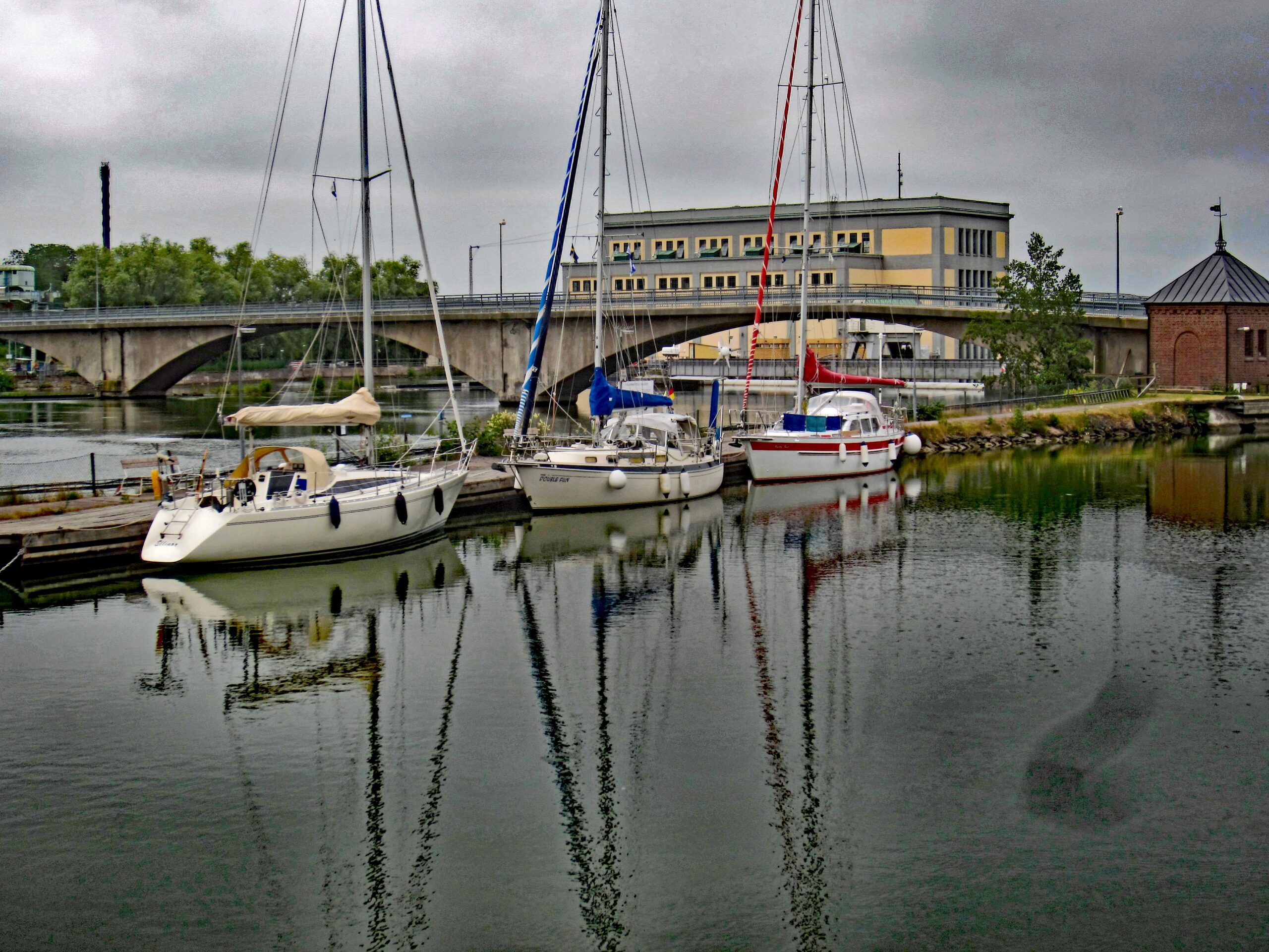 14:00h nach 16 SM Flussfahrt fest am Längssteiger in Kungälv, südlicher Anlegeplatz.