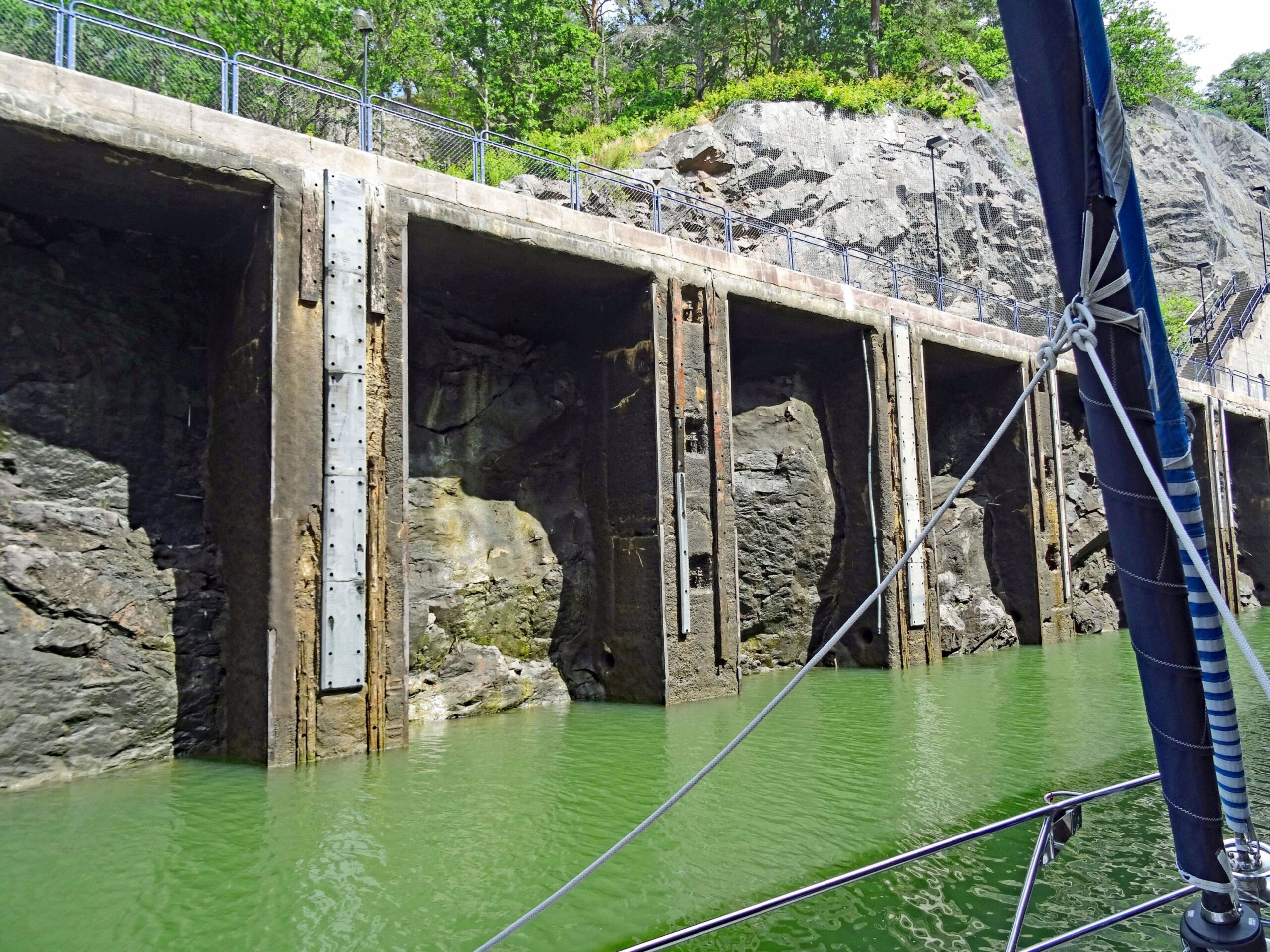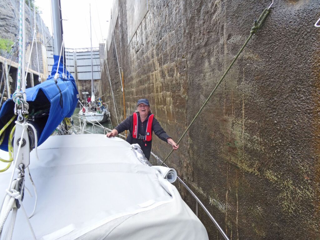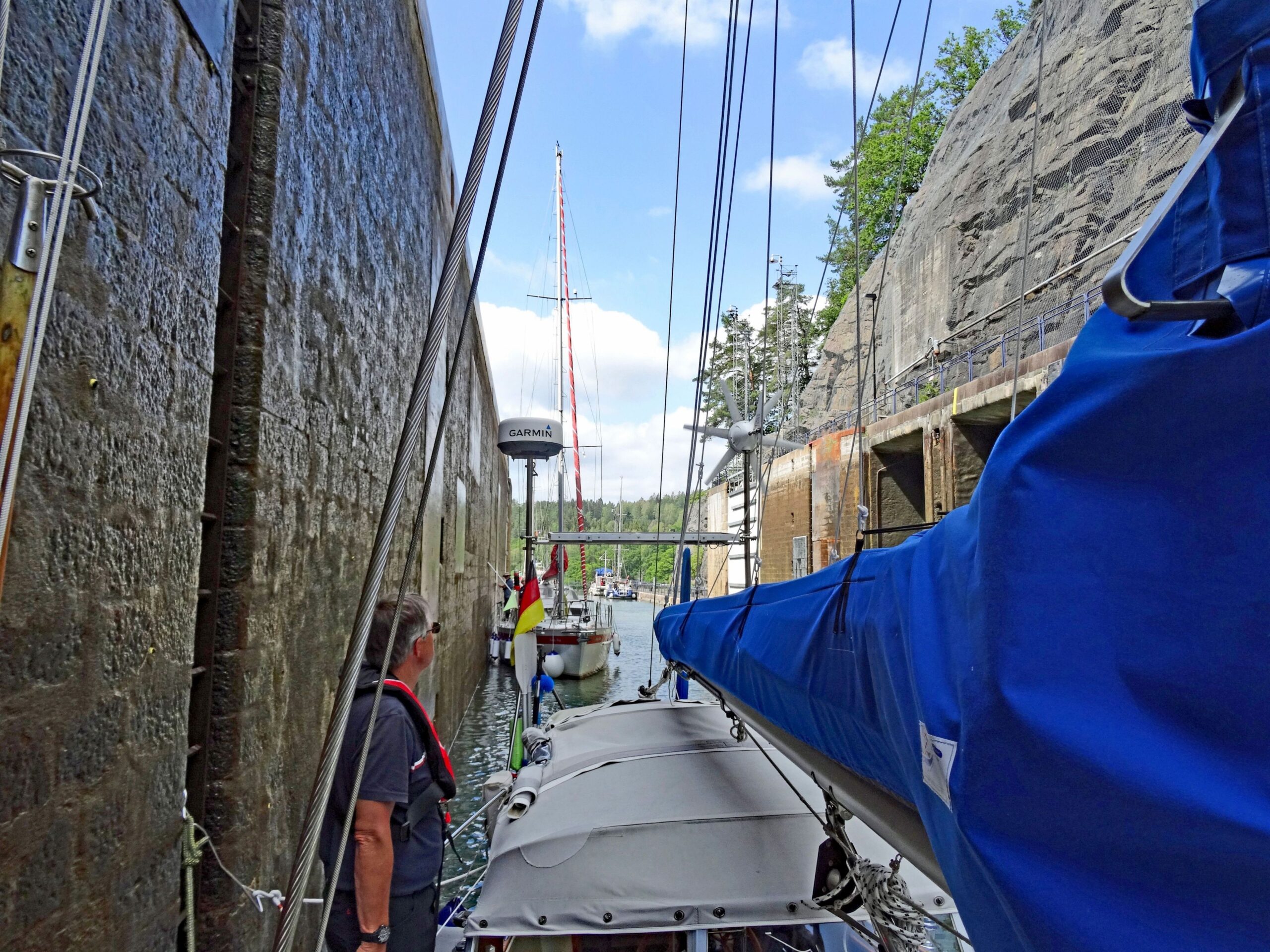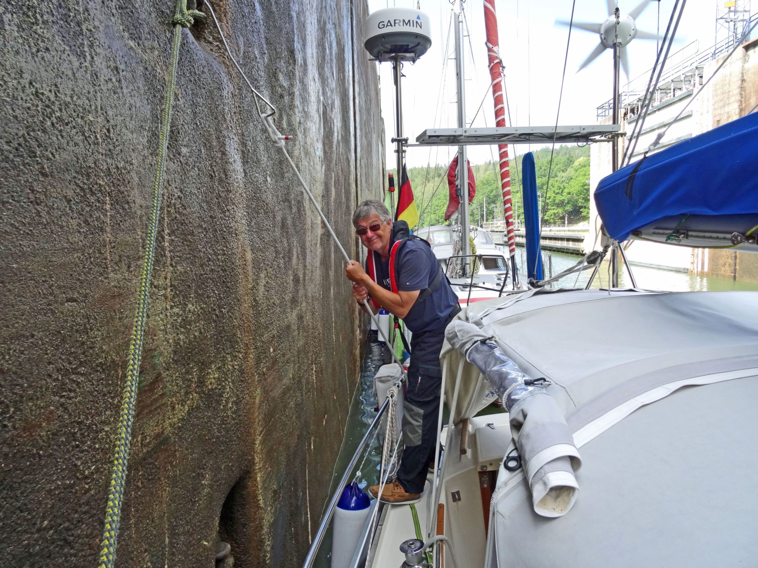 11:50h Ausfahrt erste Schleuse vor Trollhättan. Grünes Licht, daher direkt Einfahrt in die Schleusenkammer. Aufgrund der Hinweise festmachen auf der Ostseite (rechts), links praktisch keine Möglichkeit zum Festmachen. Wir bekommen in der 1. Schleuse keine Leiter zum „Hochangeln“, sondern müssen in der Höhe sehr weit auseinander liegende Poller in der Schleusenkammer nehmen. Wir arbeiten mit 2 Haken an einem Poller. Konstanze hält nach vorne, ich nach hinten, klappt prima.