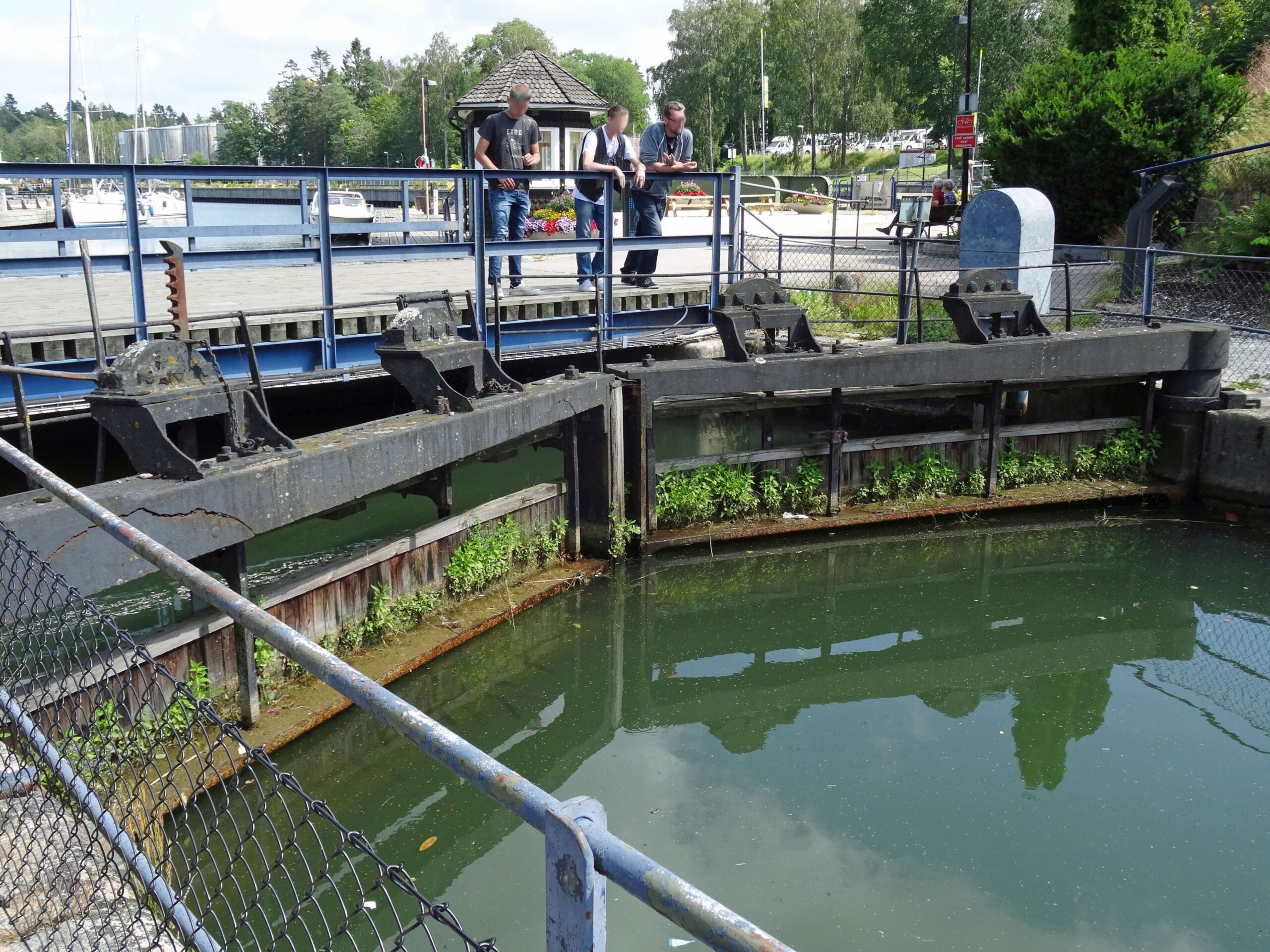 O-Ton Wolfgang: 13:30h Motor aus, fest am Wartesteg der Vandbrugga (Klappbrücke) vor der 1. Schleuse, der Ströms Sluss in Lilla Edet. Keine Antwort über Kanal 9 bzw. kein Anschluss am Telefon.