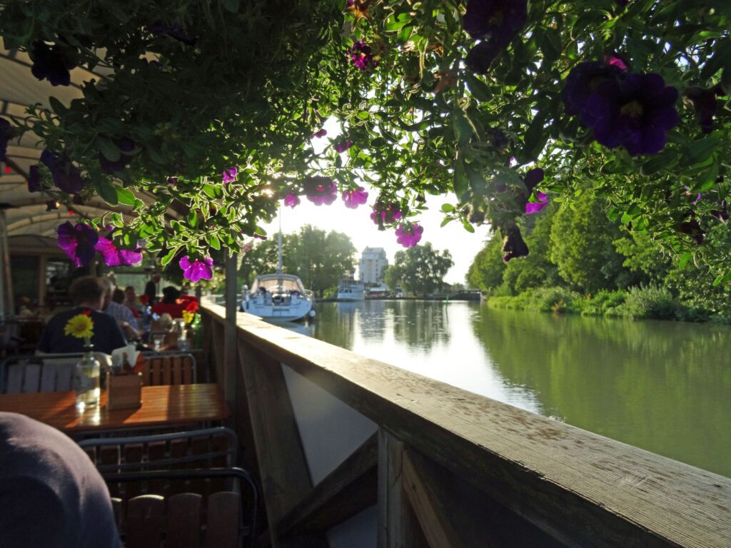 O-Ton Wolfgang: Am Vormittag mache ich trotz des Geburtstages von Konstanze etwas Hausputz, dann backt sie einen Geburtstagskuchen, den wir nachmittags auf der Marte Meo uns schmecken lassen. Glücklicherweise hat Margot eine Vanillesoße zubereitet, die wir zu dem Kuchen essen konnten, da Konstanze wohl etwas zu tief in den Salztopf gegriffen hatte. Also, der Kuchen ist wirklich sehr herzhaft. Wir probieren auch noch anderes Eis vom Eisladen genau gegenüber unserem Liegeplatz. Auch gut. Aber auch nichts Besonderes. Wir bekommen zum Abendessen aus dem Omnia einen Blumenkohlauflauf. Sehr lecker. Dann ist heute hier noch Live-Musik von 19:00h bis 22:00h, wie zu unserem Kanalabschied bestellt. Morgen dann also die letzte Etappe mit den letzten 3 Schleusen.