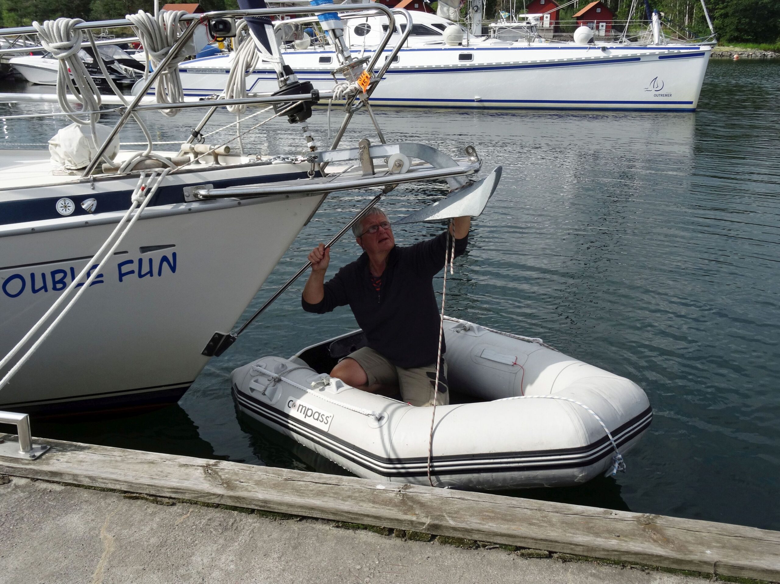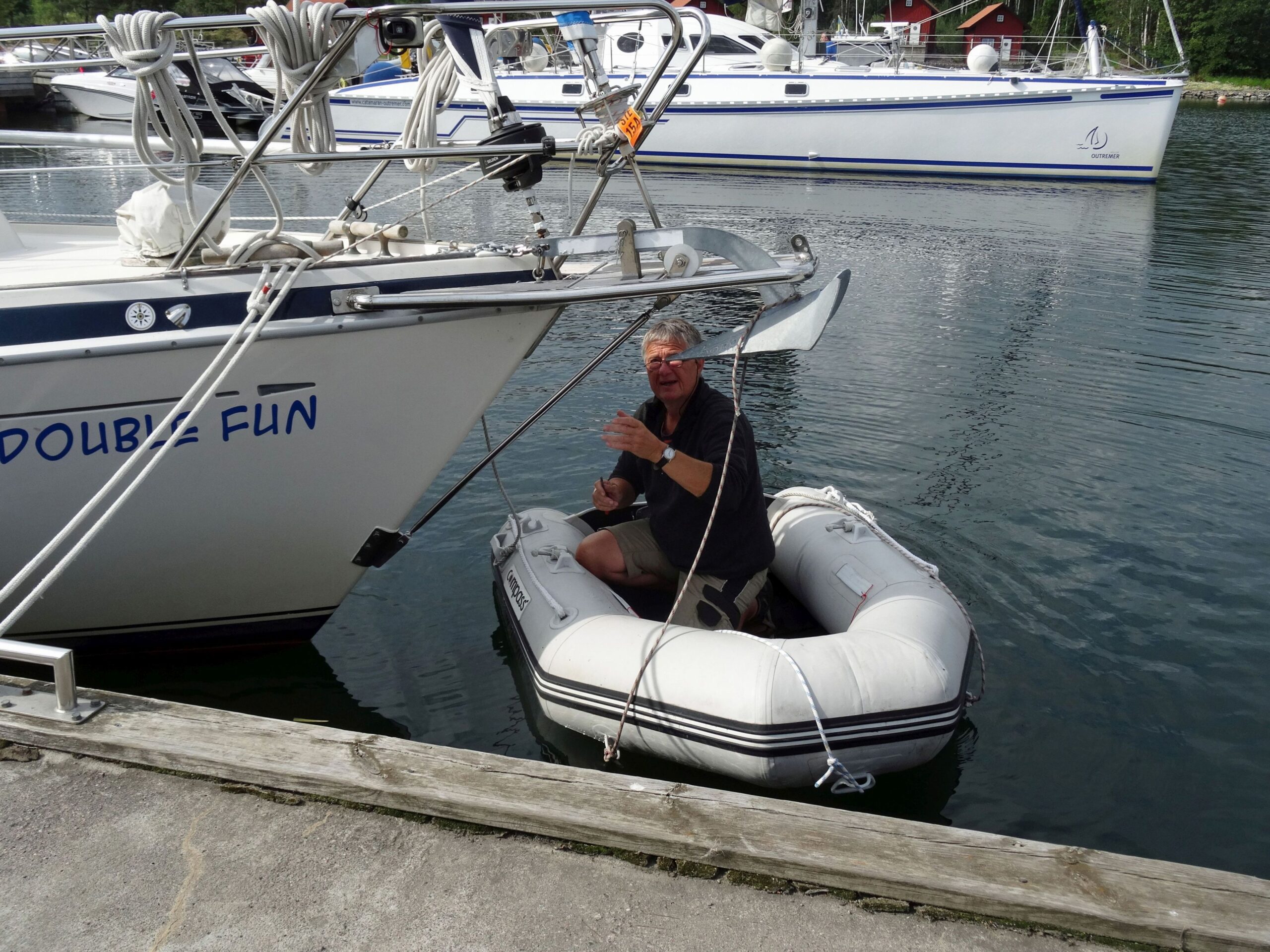 O-Ton Wolfgang: Am Vormittag packe ich mein Rad aus und fahre zu dem ca. 1 km entfernten ICA einkaufen. Gut bepackt komme ich zurück zum Boot. Das Fahrrad packe ich sofort wieder ein, da schwarze Wolken auf uns zukommen. Kurz danach fangen dann auch starke Schauer an, die dann am frühen Nachmittag zu Ende sind.