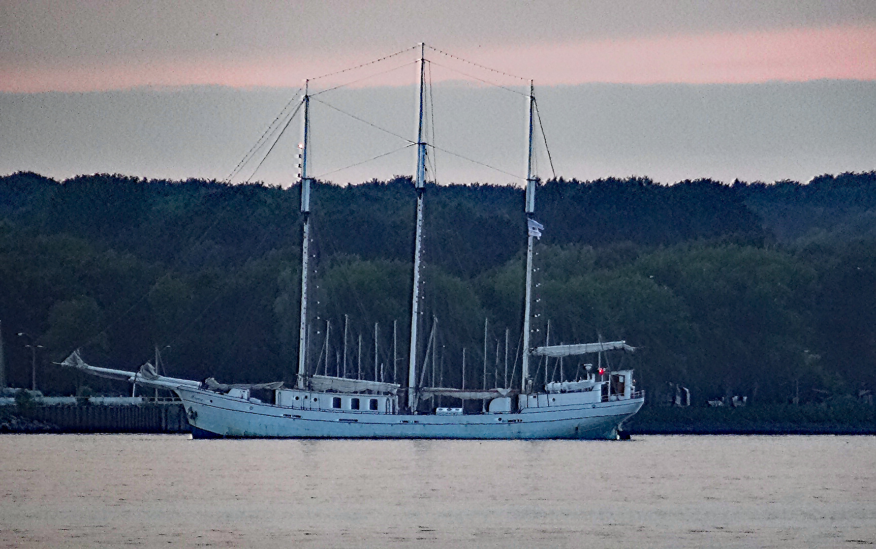 Am Abend fährt der Traditionssegler Minerva, ein Dreimastschoner aus dem Jahre 1935 in Richtung Schleuse.