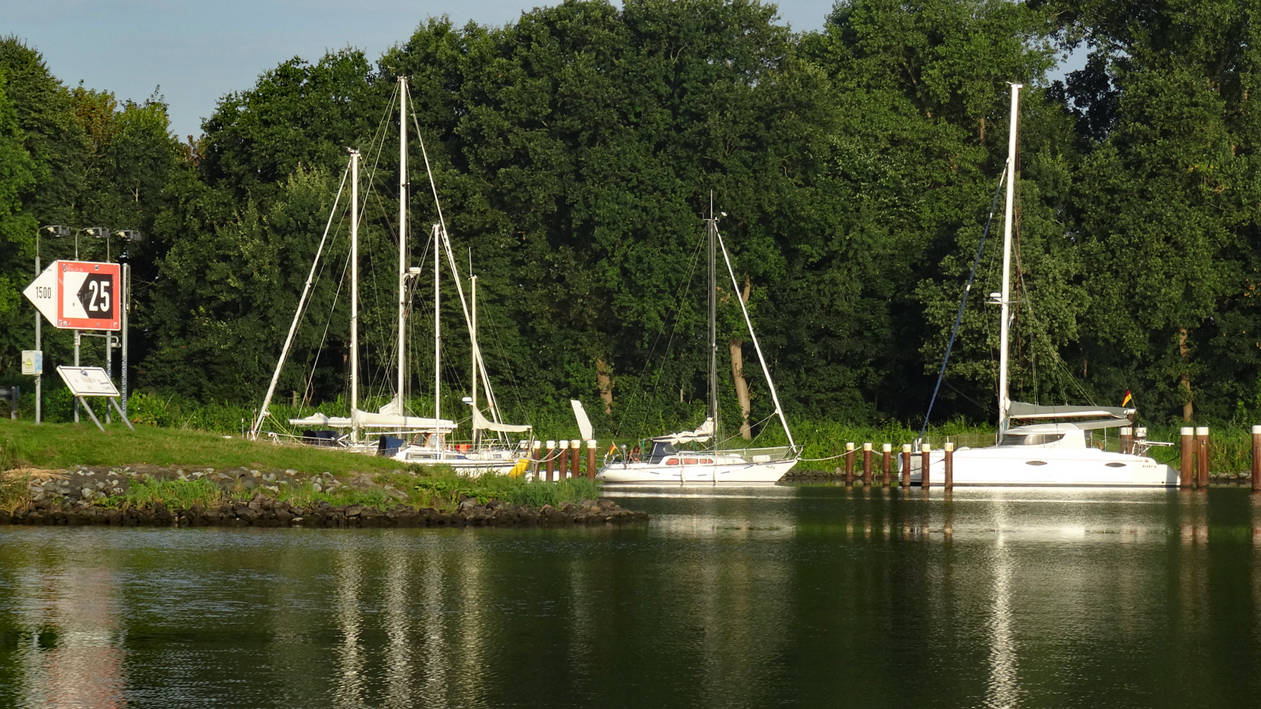 Bei km 20,7 ist die Weiche Dückerswisch. Hier liegt man ohne Landverbindung mit Bug- und Heckleinen an Dalben.