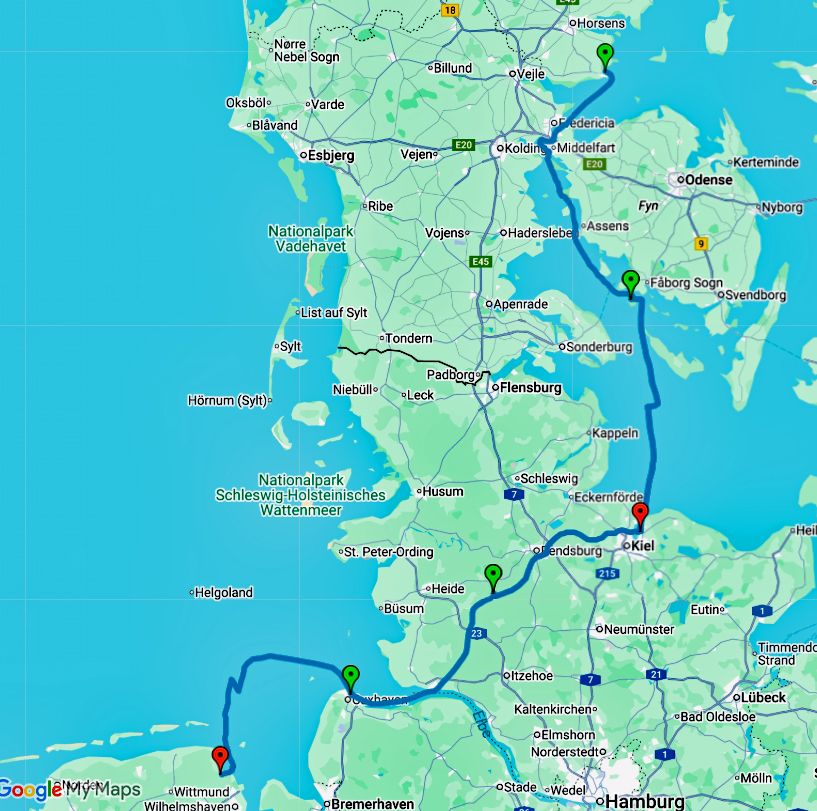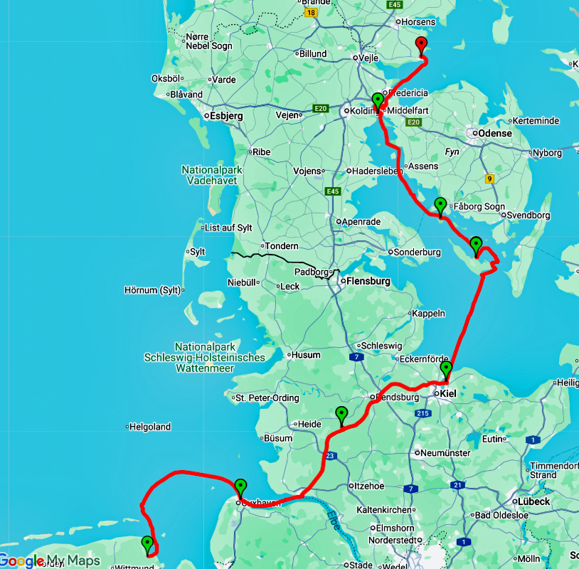 Hooksiel ⇒ Cuxhaven ⇒ NOK ⇒ Gieselaukanal ⇒ Möltenort ⇒ Ærøskøbing ⇒ Bucht vor Lyø ⇒ Bucht vor Middelfart ⇒ Juelsminde ⇒ Bucht vor Lyø ⇒ Bucht vor Möltenort ⇒ NOK - Gieselaukanal - Cuxhaven ⇒ Hooksiel